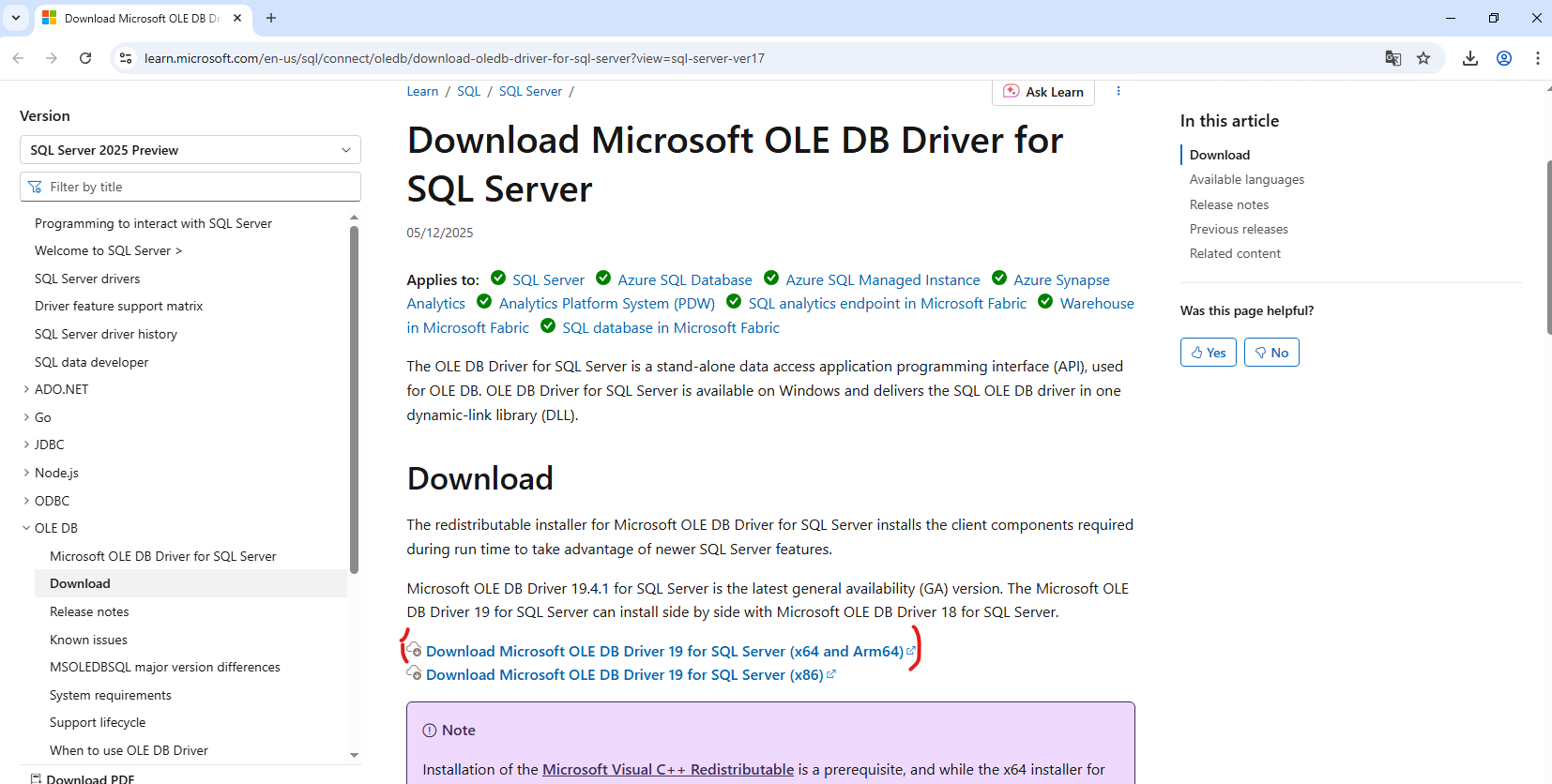 14. klikněte na odkaz pro stažení (Download Microsoft OLE DB Driver 19 for SQL Server (x64 and Arm64)).