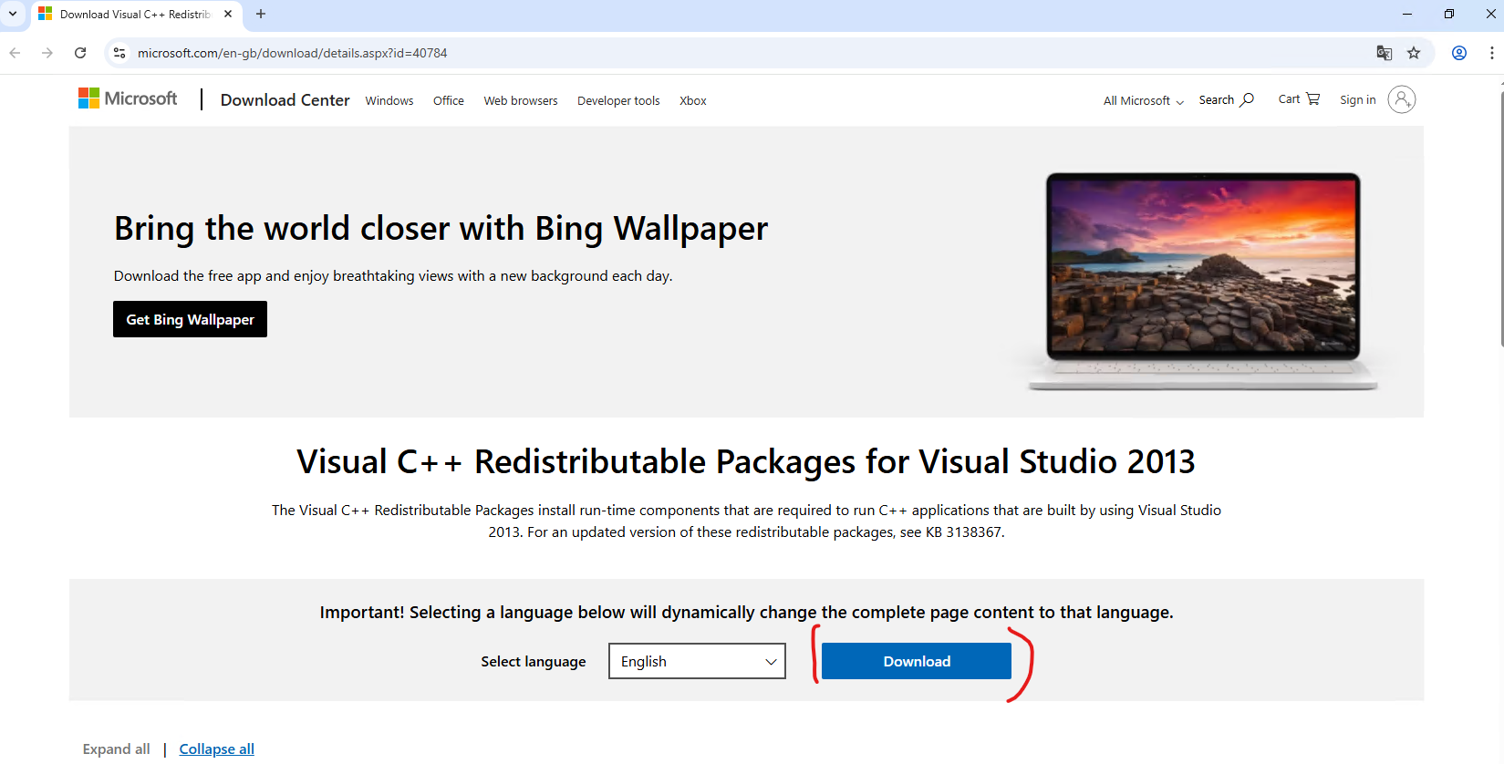 3.klikněte na odkaz MS Visual C++ 2013 Redistributable Package (x64).