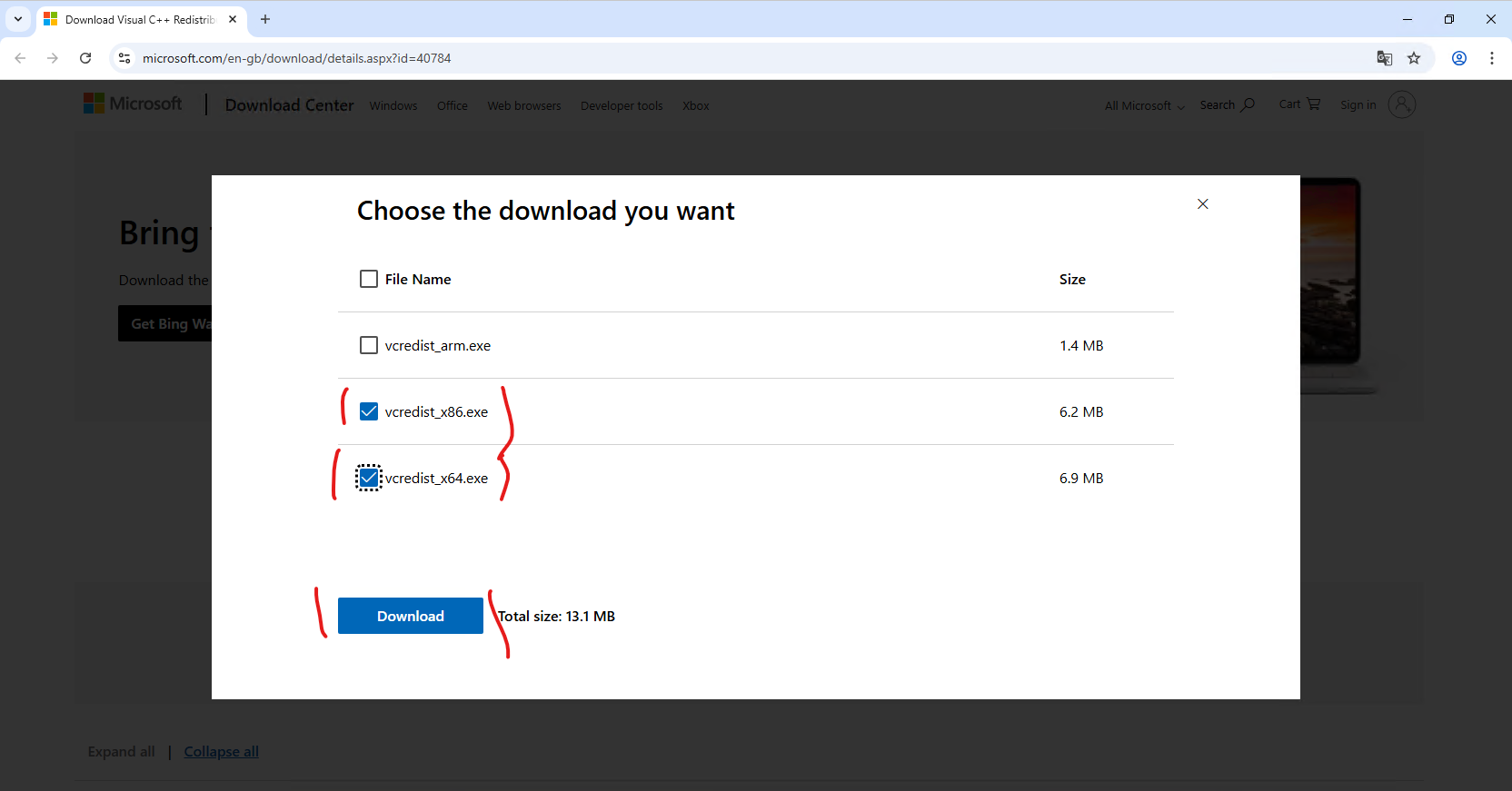 4.klikněte na download a vyberte oba soubory (x64 i x86) a klikněte na download