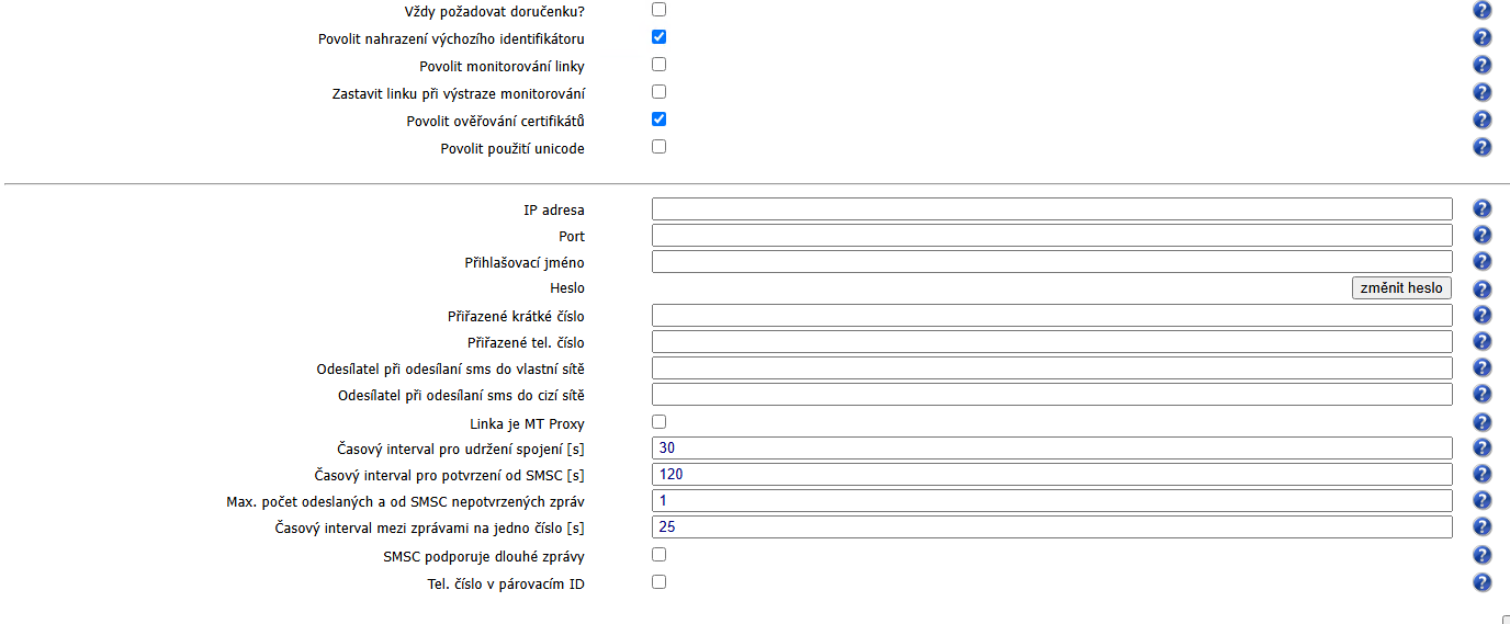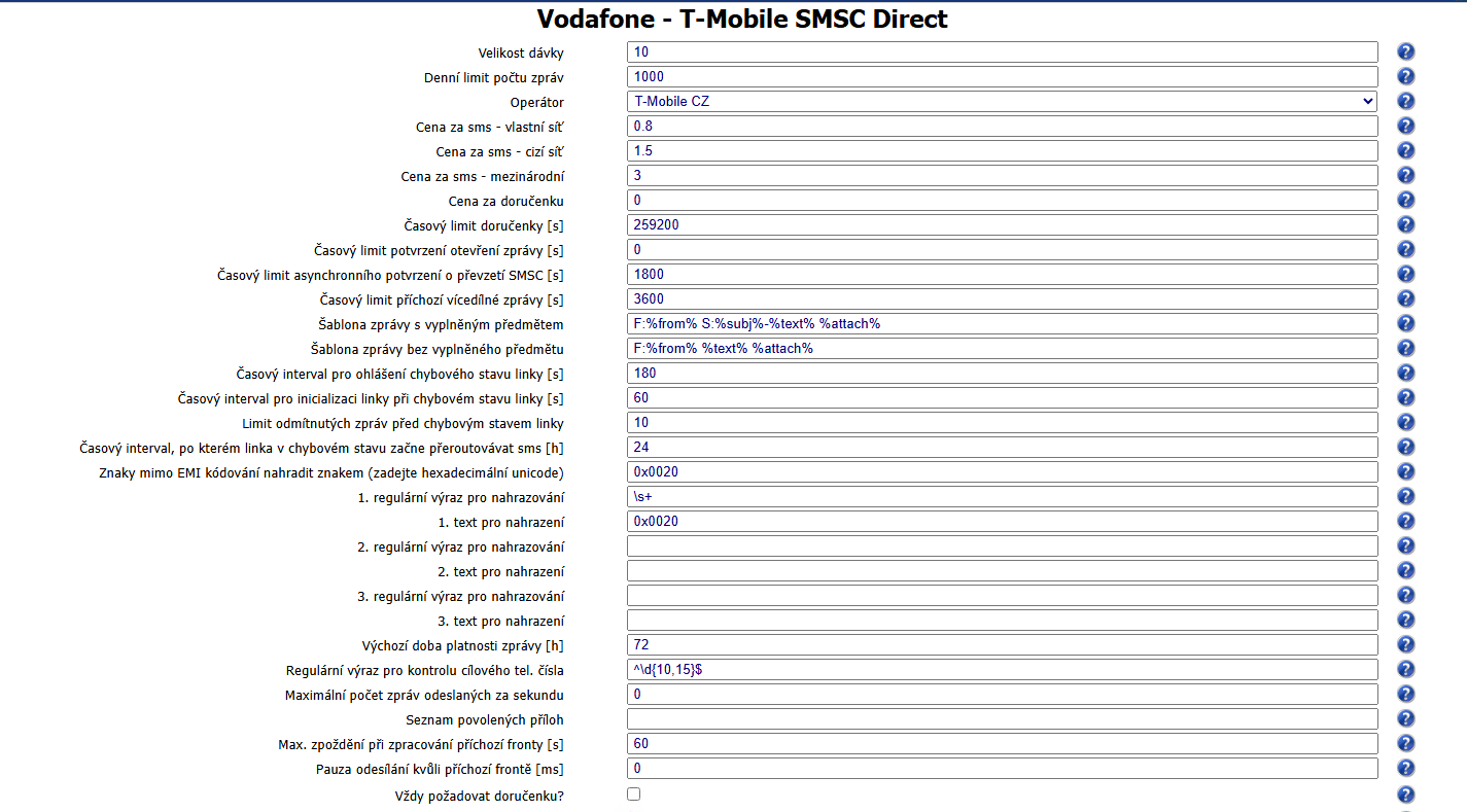 Ve formuláři Nazev_nove_linky - Vodafone SMS Připojení (UCP/EMI) můžete nastavit: