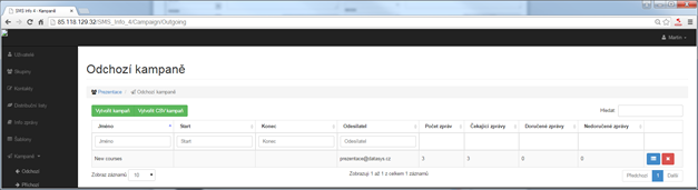 2.V lokální nabídce v řádcích jsou realizované kampaně. Jeden řádek znamená jednu kampaň. Počty zpráv udává kolik celkem bylo vytvořeno zpráv, čekající zprávy jsou zprávy zpracovávané, nebo odeslané, ale ještě nepotvrzené. DR a NDR jsou zprávy ukončené opatřeny doručenkou, či nedoručenkou.